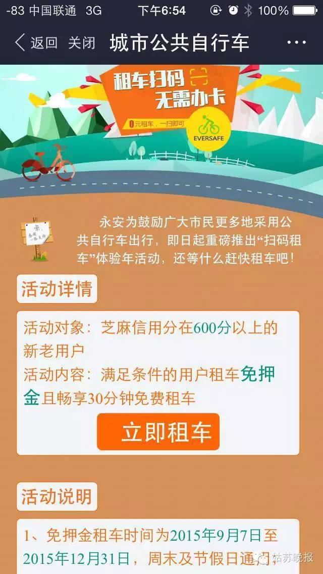 咱們總會有這種體驗 ↓↓↓ 不到一站的距離,可是走起來又好遠。就算坐公交做地鐵,還要折回去才到目的地。 這時候,路邊的綠色自行車就得瑟的看著你,“來找我啊來找我??!” 可是一摸口袋,木有卡! 呵呵噠,從今天起,這些得瑟的綠色自行車請收起你們嘲笑的嘴臉,就算蘇州人沒辦自行車卡,或者沒帶卡,也可以想騎就騎啦~ 只需要一個條件: 芝麻信用卡超過600分 芝麻信用分,咱們辦公室平時幾乎不用支付寶,信用分都有671! 最近,公共自行車租車點的鎖車樁上多了一個二維碼,上面還有租車點的名稱、編號和鎖車樁的編號。 使用方法在此: 1、打開支付寶app,在右下角點擊“芝麻信用分” 2、點擊右下角的信用生活 3、在“信用生活”里找到“永安公共自行車” 4、然后根據(jù)提示綁定支付寶賬戶就可以掃碼租車啦 掃碼成功后鎖車樁會語音報號,確認后也就借車成功了。 還車不用掃碼,只要鎖車樁提示還車成功就可以。 這個真的可以有!相當方便,有時候忘記帶卡,或者壓根兒就沒有卡的蘇州小伙伴,你們的交通工具就在你們面前。 目前已開通50個站臺 芝麻信用分掃碼租車還在試點階段, 古城區(qū)地鐵1號線、2號線沿線以及觀前地區(qū)的50個站點都可以。 “芝麻信用分”在600分以上的市民均可以實現(xiàn) 免保證金租車,半小時內(nèi)免費,超過半小時按0.5元/30分鐘計算,以此類推。 如果在借車過程中出現(xiàn)借車或還車不成功,也不要慌,除了可以撥打租車頁面的400電話,還可以撥打蘇州公共自行車的服務(wù)熱線。 哎呦不錯哦 這個周末出行 趕緊用起來吧~