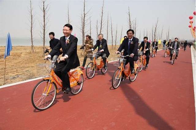 2012年3月26日,環(huán)太湖風景路建設啟動儀式在吳江市與浙江省湖州市吳興區(qū)交界處舉行,參加啟動儀式的國家住建部總工程師陳重、江蘇省副省長何權(quán)、浙江省副省長陳加元等領導在蘇州市副市長吳江市委書記徐明、吳江市代市長梁一波的陪同下,到吳江濱湖新城生態(tài)公園體驗公共自行車。