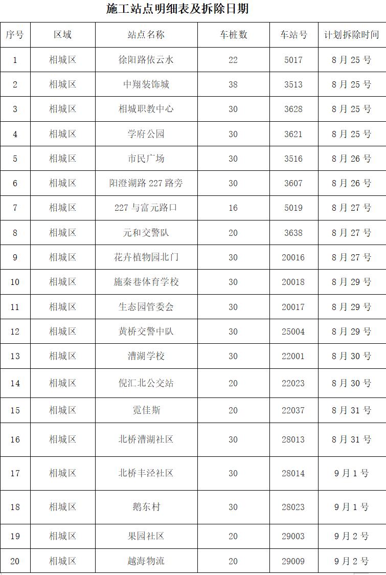 因公共自行車站點(diǎn)運(yùn)營調(diào)整,蘇州市現(xiàn)有52個站點(diǎn)將于近期拆除,給您帶來的不便敬請諒解。具體拆除站點(diǎn)及施工安排時(shí)間如下: