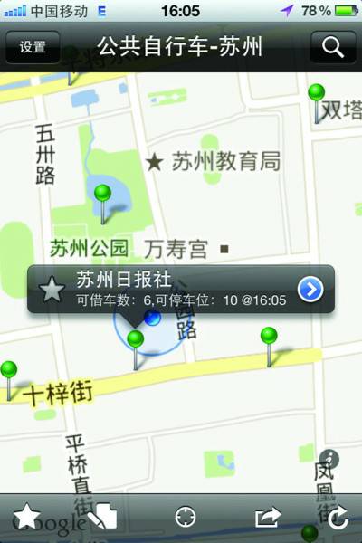 昨天,記者在自己的手機(jī)上下載了其中一款叫做公共自行車的軟件試用。這款軟件目前已經(jīng)覆蓋了蘇州、常熟、昆山、吳江、南通等地。選擇蘇州后,蘇州地圖出現(xiàn)在屏幕上,一個(gè)個(gè)綠色大頭釘就代表著一個(gè)個(gè)公共自行車網(wǎng)點(diǎn)。隨便點(diǎn)擊一個(gè)點(diǎn),就可以看到這個(gè)公共自行車的站點(diǎn)名稱、可借車數(shù)、可停車位等信息。