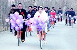 當(dāng)天帥氣的張成家胸戴紅花,精神抖擻地在13位親友的陪伴下,騎著印有青州市公共自行車標(biāo)志的環(huán)保自行車,娶回了新娘馬蘭霞。