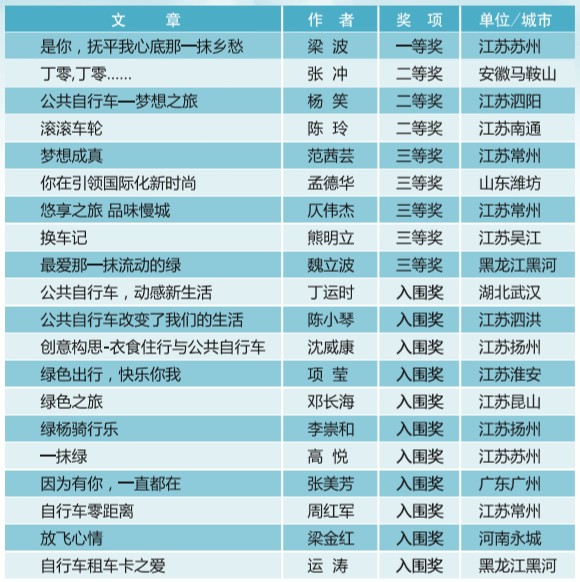 2014年5月底,常州永安公共自行車系統(tǒng)股份有限公司發(fā)布了“衣食住行與公共自行車”有獎?wù)魑拇筚悾鞲鍟r間僅短短兩個月,社會各界和公司上下熱烈響應(yīng),踴躍投稿。截止至7月底,我們一共收到征文投稿70多篇,有歌頌綠色出行的篇章,有弘揚低碳環(huán)保的詩文,有仰望永安夢想之旅的贊歌。經(jīng)過初步篩選,根據(jù)征文大賽的評選要求,邀請專業(yè)評委組進行最終評審,評選出一等獎1名,二等獎3名,三等獎5名,入圍獎11名。現(xiàn)予以公布,詳見附圖。