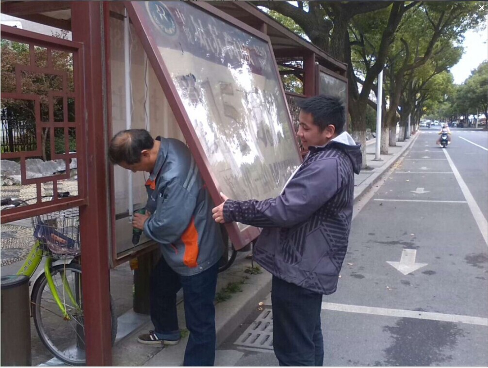 2014年11月27日,蘇州公共自行車工作人員,對姑蘇區(qū)公共自行車站點所有的廣告棚的安全隱患,進(jìn)行排查,并對所有的廣告牌加裝了固定鎖具。